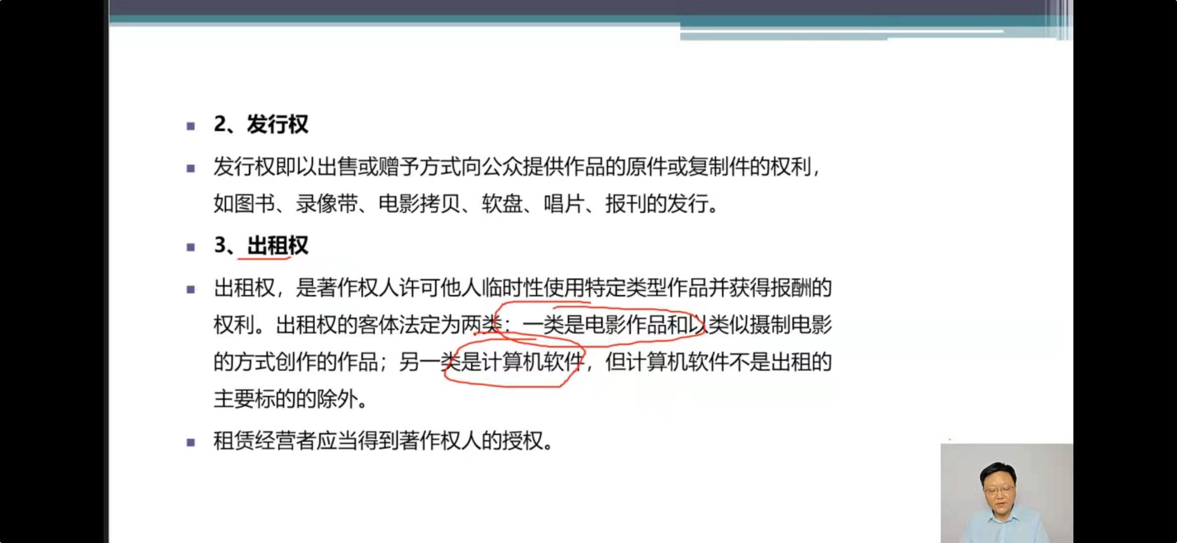 关于出租权,明确视听作品和计算机软件的权利人对原件和复制件均享有出租权;