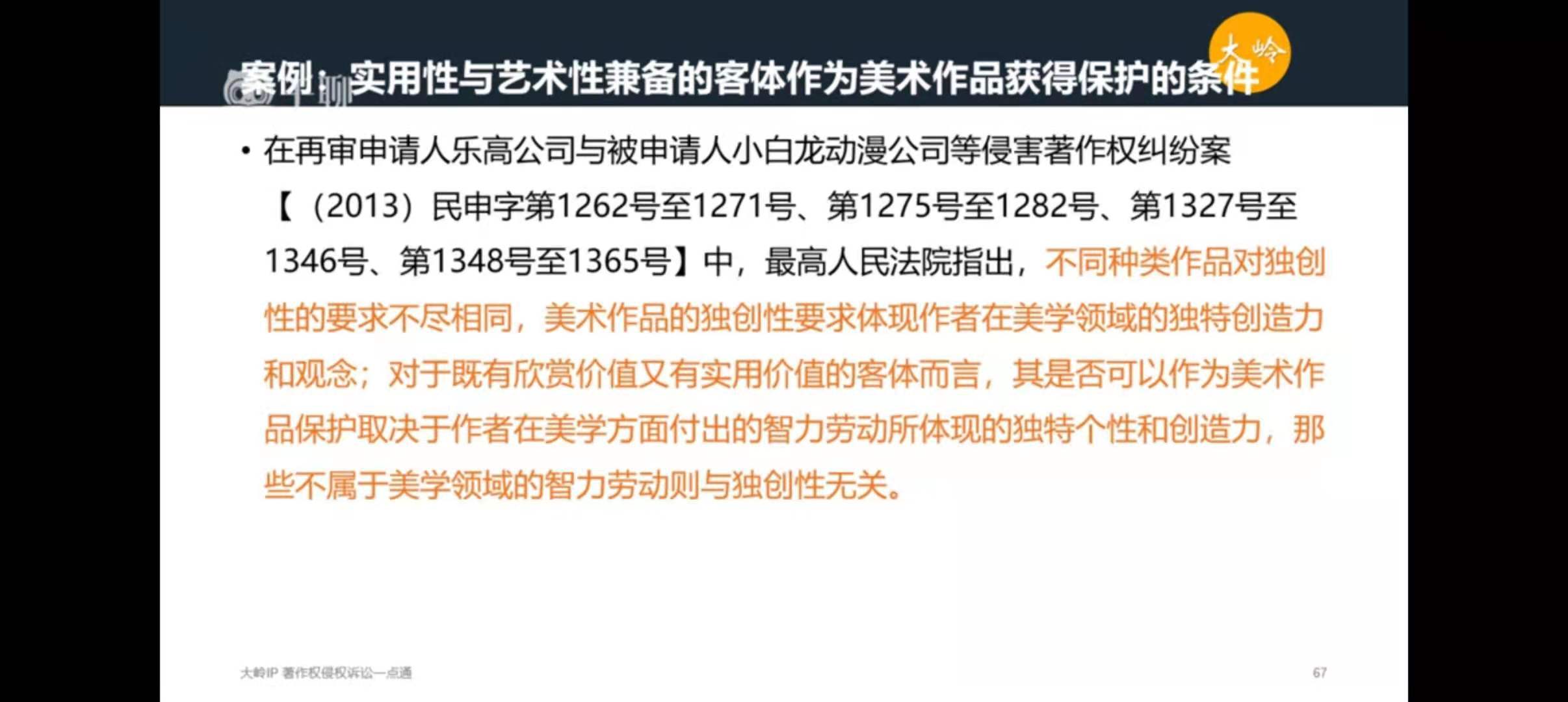(2007)冀民三终字第16号判决中,法院认定:关于实用艺术品的概念在我国著作权法中没有明文规定,一般认为,实用艺术作品应是具有实用性、艺术性,并符合作品构成要件的智力创作成果,才能受到我国著作权法的保护。服装成衣要作为实用艺术作品受到我国著作权法的保护也必须符合这些条件。