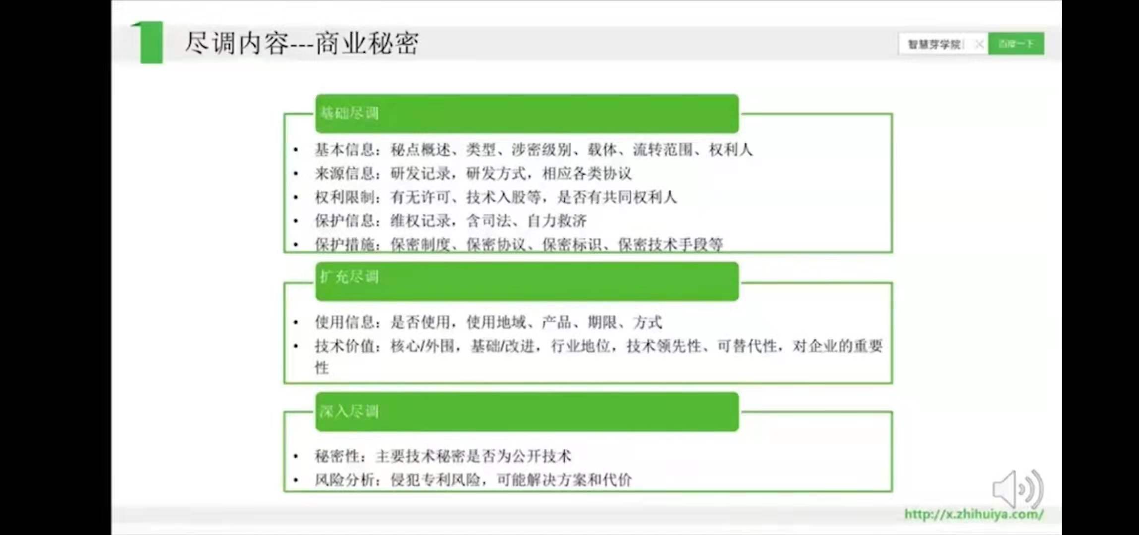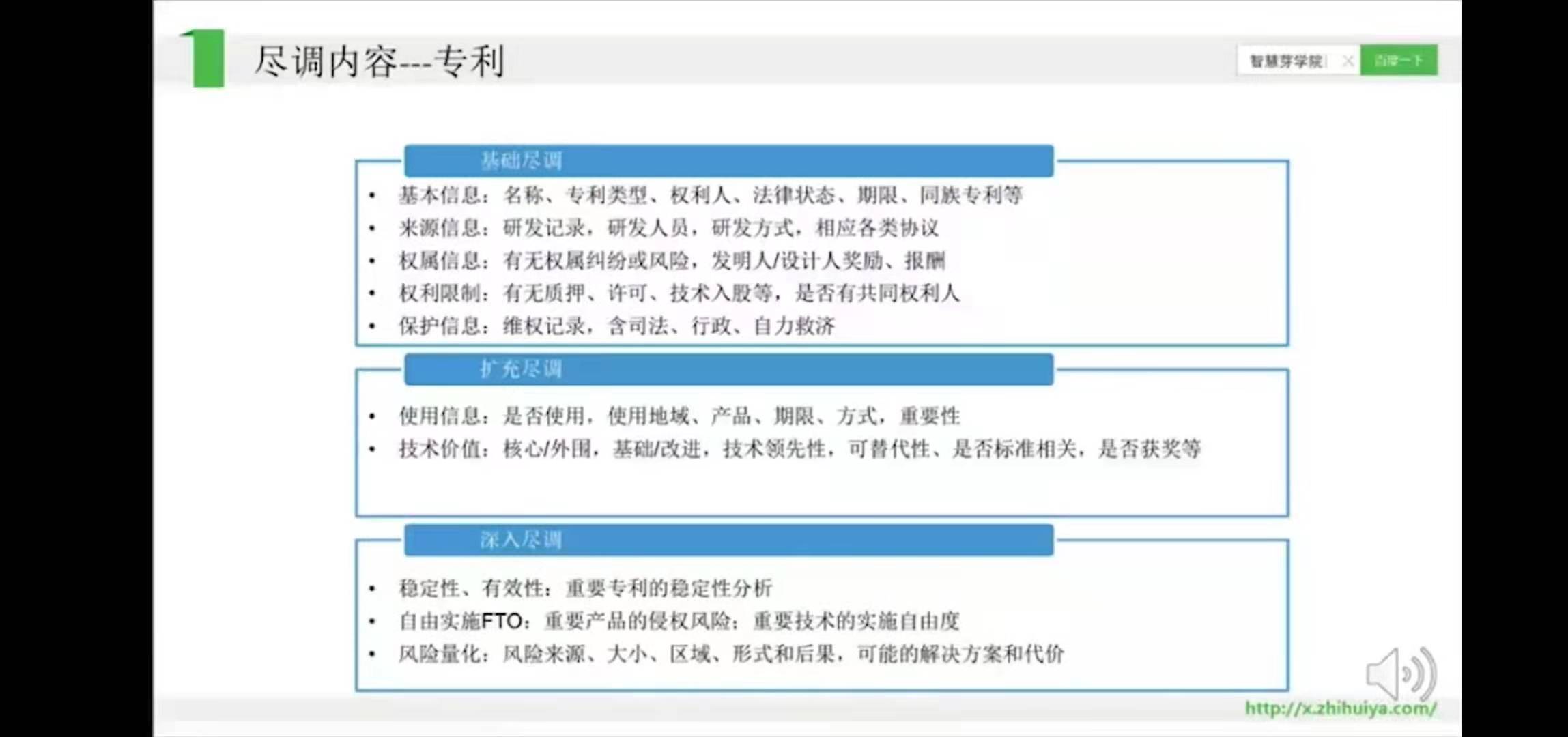 知识产权尽职调查有三个重要组成部分,首先是知识产权基础信息的调查,二是基于整理出来的基础信息进行风险分析,三是对整理出来的知识产权类信息进行价值评估,以此为整个投资项目提供决策依据、谈判筹码,并在后期的合同中安排针对所调查出的风险进行规避的方案。