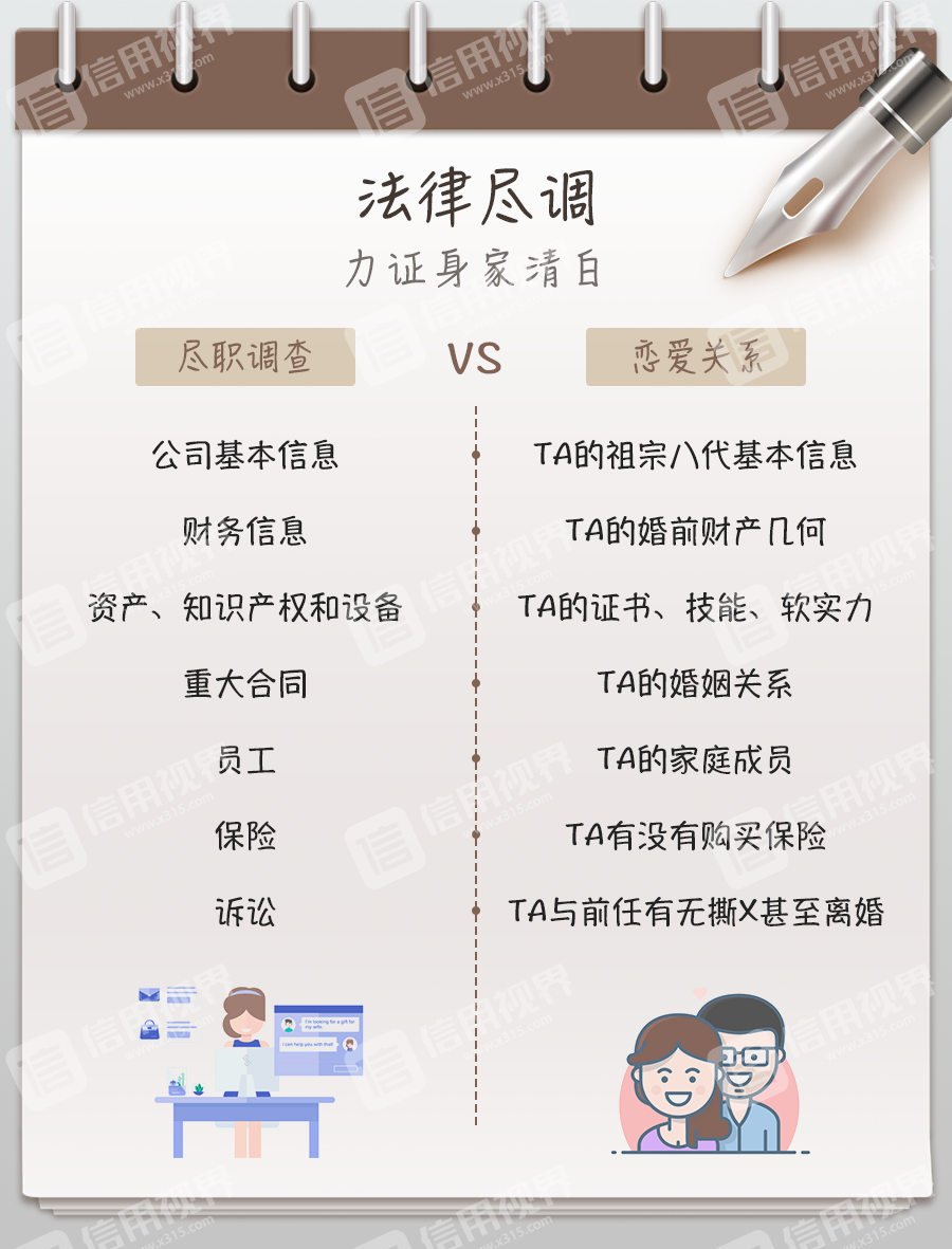 根据调查内容的不同,我们可以将尽职调查分为业务尽调、法律尽调和财务尽调三部分,投射到恋爱过程中,恋人们也会对对方的性格、情史、学历和经济实力、家庭背景进行全面考量,能否在紧迫的时间内精准把握关键点,在凌乱的信息中梳理出有用的内容,将直接决定尽职调查的结果。