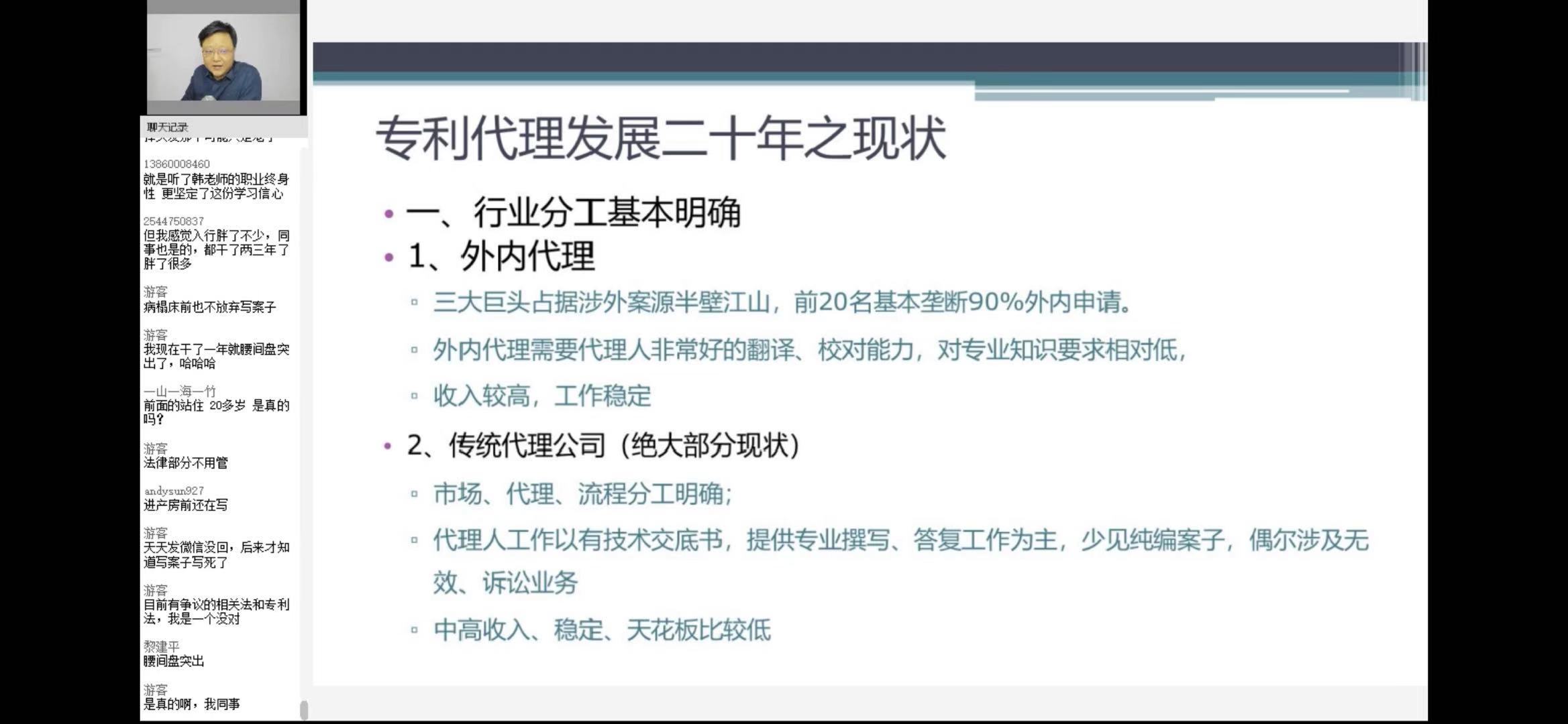 关注专利培训,从1988年起,持续不断从事专利审查员和专利代理人的培训工作,先后为数千受众讲授专利审查/专利代理实务课程,在培训专利局审查员和全国专利代理人考试培训方面声誉卓著,被网友们誉为中国专利代理人考试培训“第一人”。