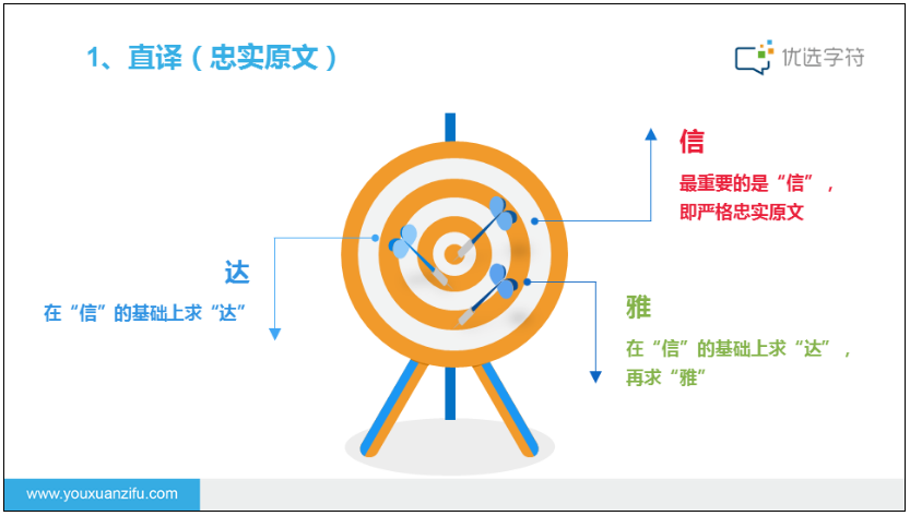 信达雅,“信”(faithfulness)指意义不悖原文,即是译文要准确,不偏离,不遗漏,也不要随意增减意思,“达”(expressiveness)指不拘泥于原文形式,译文通顺明白,“雅”(elegance)则指译文时选用的词语要得体,追求文章本身的古雅,简明优雅。