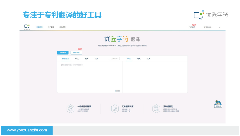 只需要您在浏览器中输入☞www.youxuanzifu.com,您想翻译的就可以交给优选字符机器翻译来帮您了,优选字符会很 快完成接近人工翻译水平的参考级译文。
